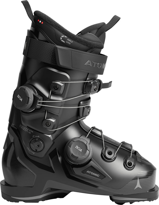 The Atomic Hawx Ultra 100 Dual BOA® brings comfort, control, and customization together in a lightweight all-mountain package. Built on a narrow 98mm last, this boot offers a precise fit with a softer, more forgiving flex for intermediate to advanced skiers. The Dual BOA® Fit System replaces traditional buckles with micro-adjustable dials for a secure, personalized fit from cuff to shell. Prolite construction reinforces key areas for powerful performance without added weight, while the Mimic Silver liner with Ankle Lock molds perfectly to your foot for superior comfort and hold. Memory Fit shell customization, Power Shift forward lean adjustment, and a 3D Stretch Toe Box ensure fine-tuned performance and all-day comfort whether carving groomers or exploring off-piste.